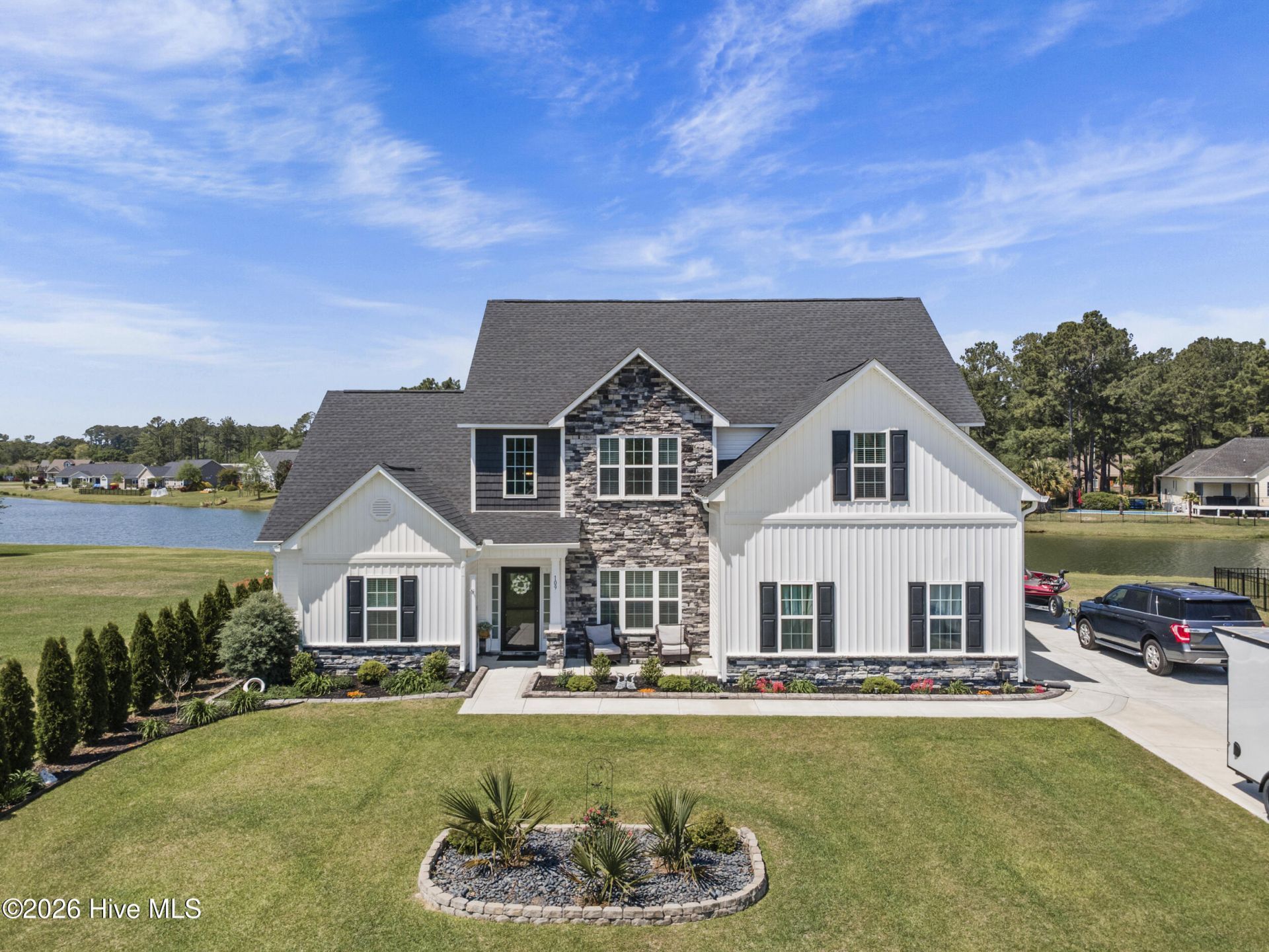 This stunning 2022-built home offers nearly 3,000 square feet of comfortable living space on almost half an acre, and the finishes throughout go far beyond new construction standard. From the moment you pull up, the curb appeal commands attention: a dramatic board-and-batten and stone exterior, crisp black shutters, manicured landscaping, and a charming front porch perfect for morning coffee. The expanded driveway gives you plenty of extra parking before you even step inside.Enter through the door into a soaring two-story foyer featuring an oak staircase with elegant wrought-iron balusters and an arched entry that leads you straight into the heart of the home. The formal dining room impresses with coffered ceilings, wainscoting, and a statement chandelier -- the kind of space that makes every dinner feel like an occasion. The kitchen is the true heart of the home, featuring an island, granite countertops, a tile backsplash, and updated appliances -- all opening directly into the living room with a cozy fireplace for the kind of easy, natural flow that makes everyday life and entertaining a breeze. Sliding glass doors lead you straight out to the backyard oasis.The primary suite is conveniently located on the main level with tray ceilings, a walk-in closet, and an ensuite complete with dual sinks, a walk-in shower and an oval soaking tub, The layout works beautifully for families of all sizes. Upstairs, three additional bedrooms plus a generous flex room--perfect as a home office or study.Once you go outside, you'll fall in love. The fully fenced backyard is your own private retreat, complete with an above-ground pool overlooking the pond, a screened-in porch, a greenhouse, and an irrigation system to keep everything looking its best. Whether you're hosting poolside or simply taking in the peaceful water views, this yard is made for making memories. Just minutes from downtown New Bern, medical facilities, shops, dining and waterfront activities.