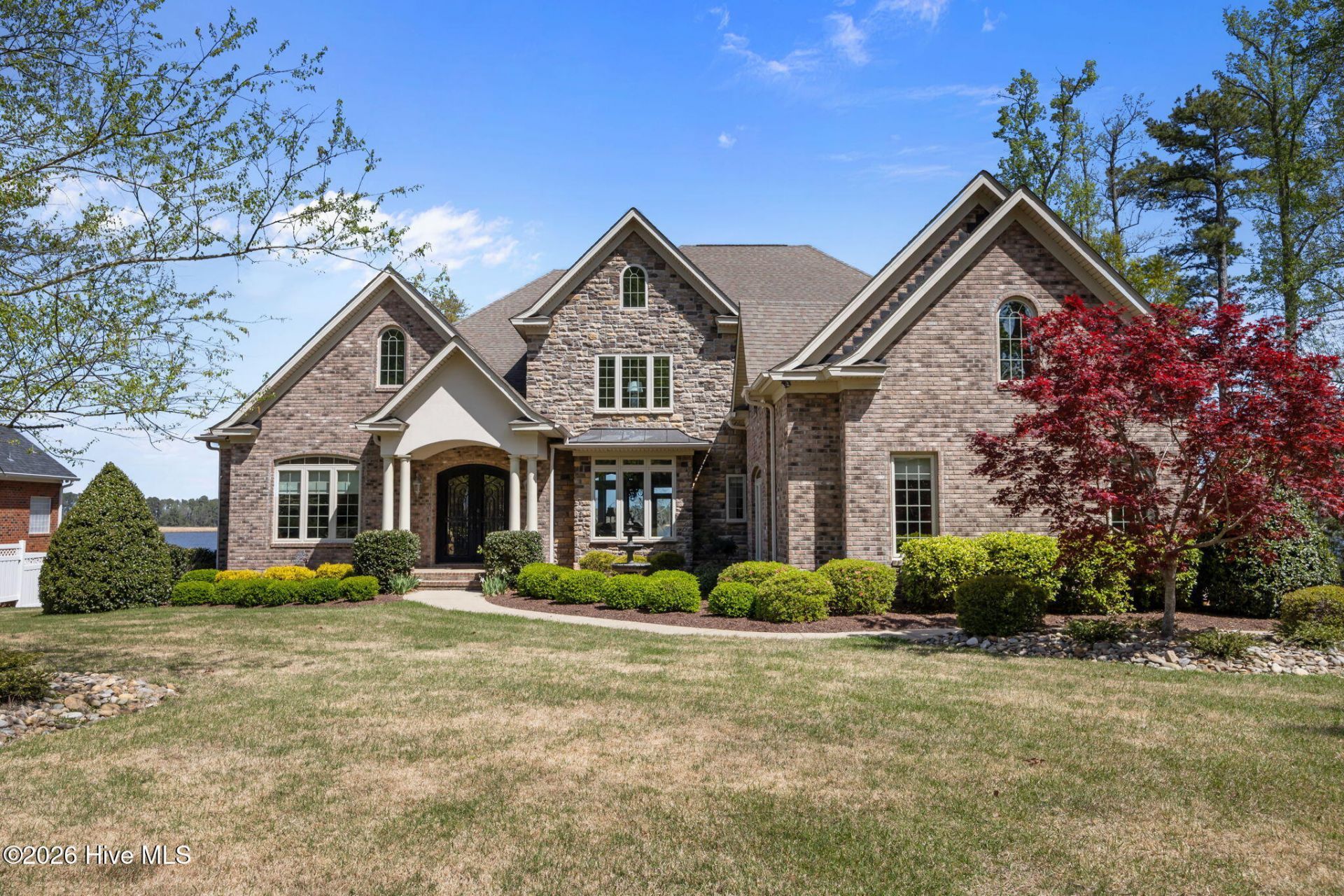 WATERFRONT LUXURY IN CYPRESS LANDING. Refined coastal living in Eastern NC. This stunning two story brick home offers timeless architecture, breathtaking water views from almost every single room on the first level . Cypress Landing community is full of exceptional amenities. From the moment you enter, the sweeping curved staircase sets the tone for elegance throughout. The grand living room features 20 ft floor to ceiling windows that fills the space with natural lighting and expansive water views, A coffered ceiling ,fireplace, and custom built ins complete this impressive space. Immediately to your right is a roomy formal dining area. The gourmet kitchen is truly the heart of the home- featuring 2 large islands ,granite countertops, stain steel appliances ,walk in pantry, and a coffee bar . The bar space can comfortably seat six people. A charming breakfast nook overlooks the water creating the perfect setting for morning coffee and everyday dining . Just off the kitchen is a den with 17 ft high floor to ceiling windows, with views of the marina and Chocowinity Bay, plus a second fireplace, built ins and direct access to the sunroom . Located directly off the sunroom room and bay side is an open porch with a tiled floor. The first floor also host an at home office with tray ceilings,. The primary suite has 2 WIC's, tray ceiling , and large windows to enjoy the water views . The primary bedroom ensuite bathroom has 2 separate vanities , a jacuzzi, plus a tiled shower. The laundry room is located adjacent to the garage with lots of cabinetry & a deep sink and even this room comes with a view. The second story of the home has beautifully crafted moldings, three good sized bedrooms and two of the bedrooms have ensuite bathrooms. One of the larger upstairs bedrooms is my favorite spots in the home. The windows in this room overlook the Bay and the views from here offer a birds eye view. This room comes with an ensuite bathroom and a huge walk in closet. For entertaining there is a roomy and privately located media room. The media room has a small kitchenette, so you are all set for making popcorn,watching your favorite movie or keeping cold beer in the frig for watching your favorite sporting events. The garage is second to none with central HVAC epoxy flooring , televisions , refrigerator, cabinets and granite counter tops. A great space for a home gym with a large heavily cased window that overlooks the front yard and fountain. The home is located on a high lot with great elevation and a gently slope to the shore. There is a small staircase down to the shoreline. This is perfect for the grands to splash around in the water, throw in a kayak or maybe a fishing line. Cypress Landing is known for being on of Eastern NC mst sought after communities . Residents enjoy a 220 slip marina, championship 18 hole golf course, swimming pools, fitness center, tennis and pickleball courts, a playground, The Bay Club by the marina and a club