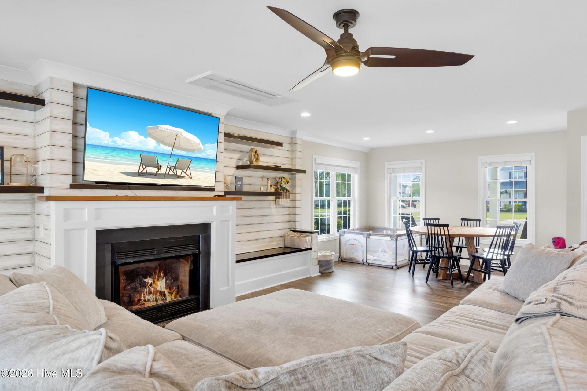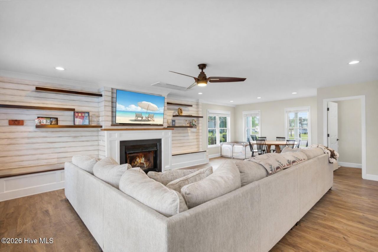 Stunning, fully renovated 4 bedroom 3.5 bathroom custom home with bonus room, ideally situated on a corner lot in the highly sought-after Star Hill North community of Cape Carteret. Thoughtfully remodeled in 2020, this residence blends refined finishes, energy-efficient systems, and integrated smart home technology for effortless coastal living. The private, fenced backyard is a true retreat, featuring an in-ground pool with splash pad, low-maintenance Trex decking, expansive patio, and outdoor shower with hot and cold water. It is perfect for entertaining. Additional highlights include outdoor speakers, pre-wiring for a future hot tub, a 12x12 storage shed, wraparound driveway with RV hookup, irrigation system, and deep well. Inside, the home showcases custom cabinetry, a stylish dry bar, sliding barn doors, and a gas fireplace that anchors the main living space. Energy-conscious upgrades include a Mitsubishi ductless HVAC system, spray foam insulation, and tankless water heater. Smart home features include a Kohler whole-house generator, MyQ garage system, and app-controlled pool vacuum. The spacious owner's suite offers a spa-inspired bath with a walk-in shower featuring rainfall and handheld fixtures, dual vanities, and a dedicated makeup area. All bedrooms are conveniently located upstairs near the laundry room, with abundant storage throughout including attic access, electronics closet, and garage shelving. Star Hill North offers exceptional amenities including community pools, tennis courts, walking trails, and access to a privately owned 27-hole championship golf course. Conveniently located less than 5 miles from the gateway to Emerald Isle, offering quick access to area beaches, boating, dining, and coastal attractions.