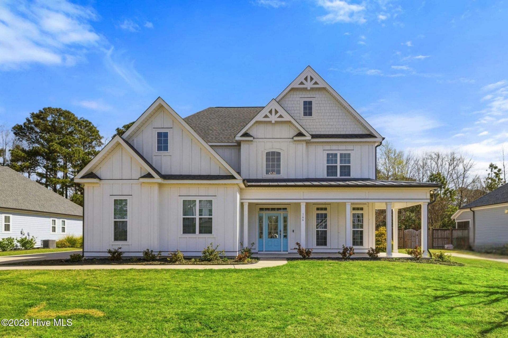 Welcome to 166 Camden Trail -- the only Blue Ridge plan by American Homesmith in Camden Community with a rare side-load garage, delivering exceptional curb appeal and a level of privacy you simply won't find anywhere else in this neighborhood. Now priced at $649,900 -- this is the move. Built in 2020 and never previously listed, this beautifully maintained modern coastal farmhouse is move-in ready and priced to sell. Pre-listing inspection complete, all repairs made, freshly painted throughout, and full disclosure on file -- a standard of seller transparency that sets this listing apart in today's market. Nestled in Camden Community on Virginia Creek in sought-after Hampstead, NC, this 4 bedroom, 2.5 bath, 2,892 sq ft home sits at the sweet spot between Wilmington and Jacksonville -- minutes from the Intracoastal Waterway, steps from the community dock and kayak launch, less than 15 minutes to the sugar sand beaches of Surf City and Topsail Island, and zoned for the highly rated Topsail School District. Inside, architectural details elevate every room. A grand two-story foyer opens to a formal dining room before flowing into the open-concept main living area -- a coffered ceiling family room with gas log fireplace and shiplap surround that connects seamlessly to the chef's kitchen and breakfast area. The kitchen is built for real life and serious entertaining: timeless white cabinetry, quartz countertops, subway tile backsplash, farmhouse sink, large center island, gas cooktop, double wall ovens, and stainless steel appliances throughout. Tray ceilings, coffered ceilings, wainscoting, and hardwood-style LVP flooring run through the main level -- details that push this home well above comparable resales and new construction at this price point. All four bedrooms and laundry are on the upper level, providing privacy and separation from main living. The owner's suite features a tray ceiling, dual vanity, soaking tub, tiled walk-in shower, and an oversized walk-in closet with custom wood shelving that connects directly to the laundry room. All three secondary bedrooms include walk-in closets and share a full bath. Outdoor living is equally compelling. A large covered wrap-around front porch is perfect for morning coffee or evening conversations. Out back, a covered rear porch and patio overlook a fully sodded, privacy-fenced, and irrigated backyard -- with an additional concrete patio pad, brick firepit, and raised garden beds that add both function and beauty to the outdoor space. The community itself is the lifestyle upgrade. Crepe myrtle-lined streets lead to the dock and kayak launch on Virginia Creek -- offering direct water access to Sloop Point Marina and the public boat ramp. Whether you're launching a kayak at sunrise or paddleboarding on a weekday afternoon, waterfront living is steps from your front door. Ideal for military professionals with an easy commute to Camp Lejeune or MCAS New River. Perfect for remote workers, growing families, r