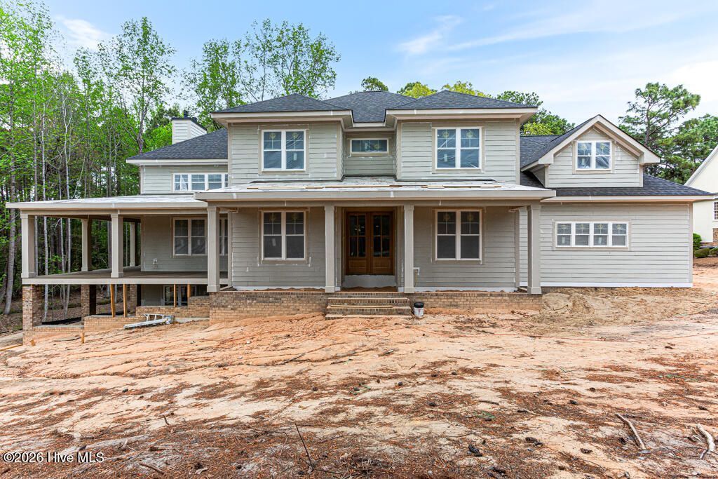 Picture yourself lounging in a rocking chair on your wraparound porch, gazing across your tranquil pond view, basking in the sun as it sets behind the towering pines. Your dream can become a reality at 48 Glasgow Drive, a stunning 5,104 square foot new construction home in the prestigious Pinewild Country Club. Minutes to world-renowned downtown Pinehurst, this gated community features two championship 18 hole golf courses and a quick Par 3 - plenty of options for golf lovers. Enjoy the private lake, walking trails, pool, tennis courts, and playground. Stay tuned as renovations are underway on the brand new $18m clubhouse with restaurant, set to open early 2027! Centrally located with easy access to the main gate, at 48 Glasgow you'll discover modern luxury meets Southern charm. You can enjoy plenty of space to entertain and unwind with 4 bedrooms, a finished walk-out basement, 2 bonus rooms, 5 full bathrooms, and 2 half baths. Each bedroom is en suite, with its own bathroom and custom wooden closets. The main level primary bedroom has a private wooded view, shiplap ceiling, dual vanity sink, and a zero-entry, marble tile shower. Easy access across the hall to the full laundry room with a utility sink. The luxurious living room features a pond view and has shiplap extending from the gas fireplace, soaring up to the 24' ceilings. Savor the chef's kitchen, including American made Kith Cabinets, a 48'' gas range, stainless steel appliances, and island with seating. Need more cabinet space? You'll find plenty in the scullery, along with an additional prep sink and wine fridge. The adjoining formal dining and office/flex space both have access to the porch. The main level also has one en suite bedroom. Rare in the South, the highly coveted walkout finished basement has ample natural sunlight, 3 rooms, a second gas fireplace, and a half bath. Sliding glass doors open to the covered wraparound patio, providing even more opportunities for outdoor entertainment. The second level includes 2 en suite bedrooms, a loft overlooking the living room, stackable laundry in the hallway, and a giant bonus room with full bath and walk-in attic access. Spacious side-entry 3 car garage leads to a mud room and half bath with easy access to the kitchen. Never take a cold shower again with 2 tankless, propane water heaters. Enjoy your privacy on a wooded 1.29 acre lot. A truly incomparable home with high quality finishes throughout - an opportunity you don't want to miss! Seller offering Full Membership to Pinewild CC. Estimated completion: June 2026