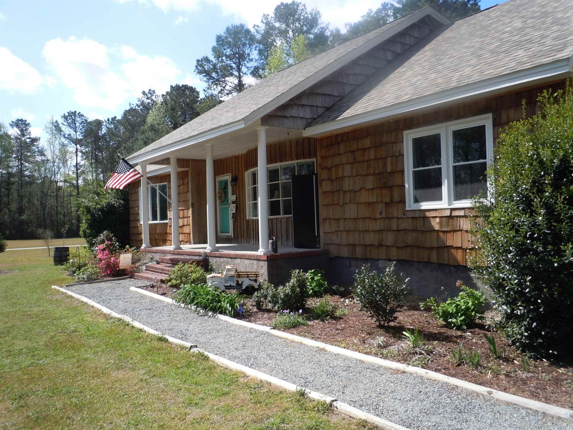 For sale this beautiful Cape Cod cedar home in Southfield Estates is on a quaint cul-de-sac just outside Tabor City. Situated on a large 1.68 acre lot mostly cleared but with some trees on the back and side of the property. On the first level of the home is a large master bedroom with a walk-in closet and whirlpool bathtub and shower/tub combo. Bay windows in the master and den allow for great natural light throughout. The den features a fireplace with propane gas logs. The spacious kitchen has all stainless steel appliances, granite counter tops and lots of cabinet space. Also on the first level is a separate bedroom, kitchenette area, laundry room and full bath. This can be accessed from the home or by its own separate outside entrance. This is great for a mother-in-law suite or rental income producer. Upstairs are 2 bedrooms and bath with the possibility of a 3rd bedroom along with a large bonus room that could be a den, office, exercise room, etc. Outdoors is a landscaped yard with a 12x24x52 above ground salt water pool, a fishpond with a waterfall, greenhouse and walking trail through the woods. Storage is a plus on this property-there is a 30x30 open front garage/workshop, a 20x25 RV shed 15 high in center and 11 feet on the sides and 1 more 12x24 storage building. Updated features of the home include: Newer windows, roof, deck and downstairs heat pump with warranty. Much of the interior of the home has just been painted. This quiet community has Restrictive Covenants and a small yearly HOA fee. Located only a short drive to Calabash, NC and North Myrtle Beach, SC. Enjoy day trips to the Atlantic Ocean, shopping and restaurants.